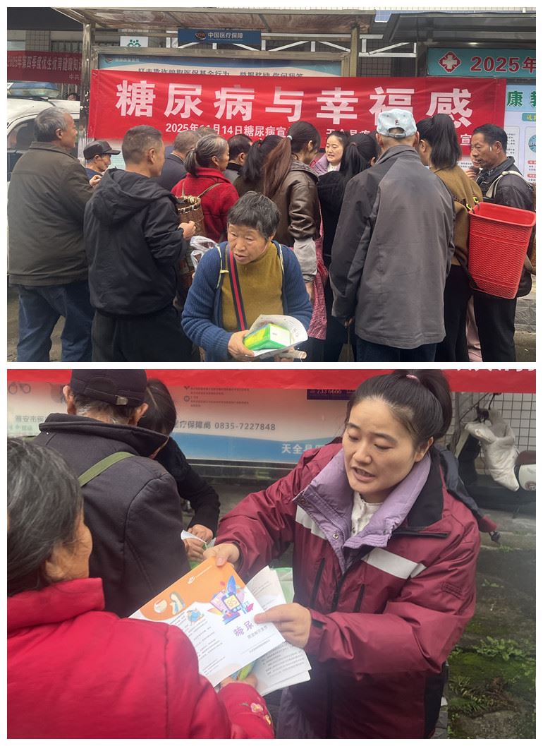 2025年11月14日是“世界糖尿病日”,为提升辖区居民对糖尿病的认知水平与防控能力,天全县疾病预防控制中心以仁义镇赶集日为契机,围绕“糖尿病与幸福感”主题,开展了形式多样、内容丰富的健康宣传活动。
